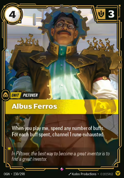 Mechanically, Albus Ferros is all about value transformation. When he enters play, you can spend any number of buffs.