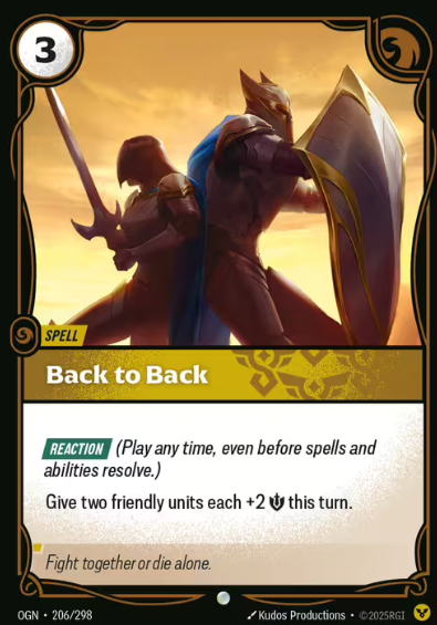 Back to Back is a 3-cost Reaction spell, meaning it can be cast anytime—including during spell stacks and opponent attacks.