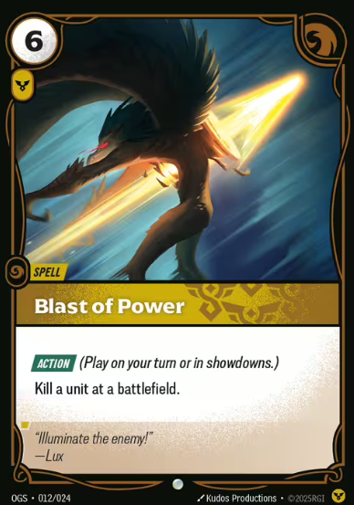 Blast of Power is card 012 out of 024 in the Riftbound preview wave. No rarity marker on this one yet, but given the power and cost, it’s likely a rare or even super rare.