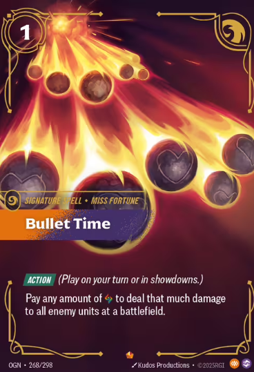 Bullet Time is card 268/298, part of the OGN set, and flagged as a Signature Spell for Miss Fortune.