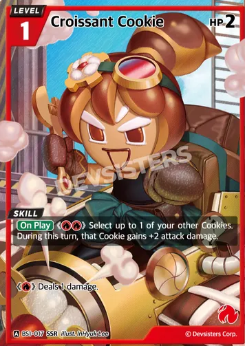 Croissant Cookie is a Level 1 red unit with 2 HP, and while her base attack only deals 1 damage, her on play skill is what makes her shine. For two red energy, she lets one of your other Cookies gain +2 attack damage for the turn.