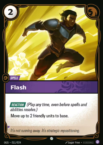 Flash is a Reaction spell that lets you move up to two friendly units back to base. That’s it. Simple on the surface, but it opens up so many lines.