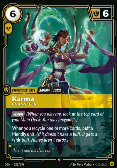 In a set where a lot of units frontload tempo or raw aggression, Karma leans in the opposite direction: recursive value, layered scaling, and deck finesse.