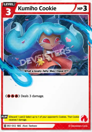 Kumiho Cookie from Cookie Run Braverse TCG is sugar-coated danger. She looks like she is offering you a flower, but in reality, she is burning straight through your board.