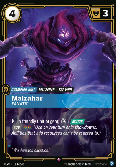 Card 113/298, Malzahar hasn’t been confirmed as foil or overnumbered yet, but given how clean his combo potential is, don’t be surprised if he ends up in a meta deck that leans on engine pieces and acceleration.