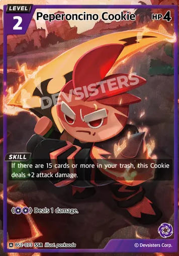 If you’ve got fifteen or more cards in your trash, Peperoncino Cookie gets +2 attack damage. Suddenly that little 1 damage swing turns into 3 damage, which is insane for something this cheap.