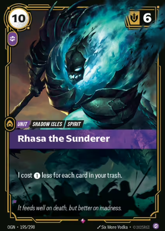 Rhaza the Sunderer is a 10-cost, 6-power Spirit Unit from Shadow Isles that costs 1 less for every card in your trash. That cost scaling is no joke. Even by mid-game, a graveyard-heavy deck can reliably slam this for 4–5 mana, sometimes even less.