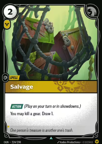 Salvage is card 224/298 in the OGN set and currently appears to be a common or uncommon, judging by the cost, effect simplicity, and visual design.