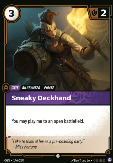 Sneaky Deckhand is a 3-cost Unit with 2 Power that comes with a deceptively simple line: You may play me to an open battlefield.