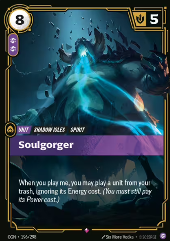 Let’s talk effect. Soulgorger reads: “When you play me, you may play a unit from your trash, ignoring its Energy cost. (You must still pay its Power cost.)” That’s a one-line necromantic swing.