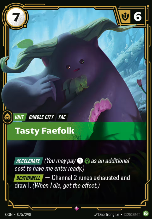 Tasty Faefolk is card 075/298 in the OGN set. No foil or alt art variant has been confirmed yet, and it’s too early to say if it will be a meta staple.