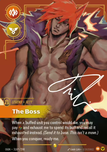 The Boss (Signed Variant) is pure flex. In a set stacked with cosmic horrors, sharpened spellcasters, and void-born killers, here comes Sett—bare-chested, bored, and ready to throw hands.