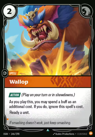 Wallop reads: “As you play this, you may spend a buff as an additional cost. If you do, ignore this spell’s cost. Ready a unit.” That one line opens a lot of doors.